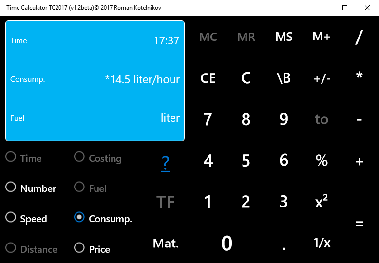 Unlike other similar calculators, the user can choose the kind of numbers that will be used for calculations (number, time, speed, distance, cost, fuel, consumption, rate). The information of measures will show up on displays for convenience (consumption in liters/hour, speed in km/h etc.).